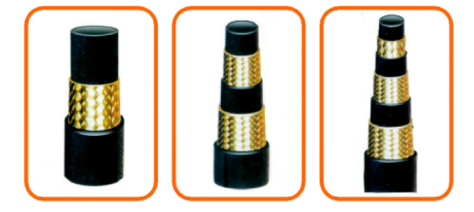 高壓鋼絲編織膠管結構是由耐液體的合成膠管內膠層、中膠層、Ⅰ或Ⅱ層或Ⅲ層鋼絲編織增強層及耐氣候性能優良的合成橡膠外膠層組成。